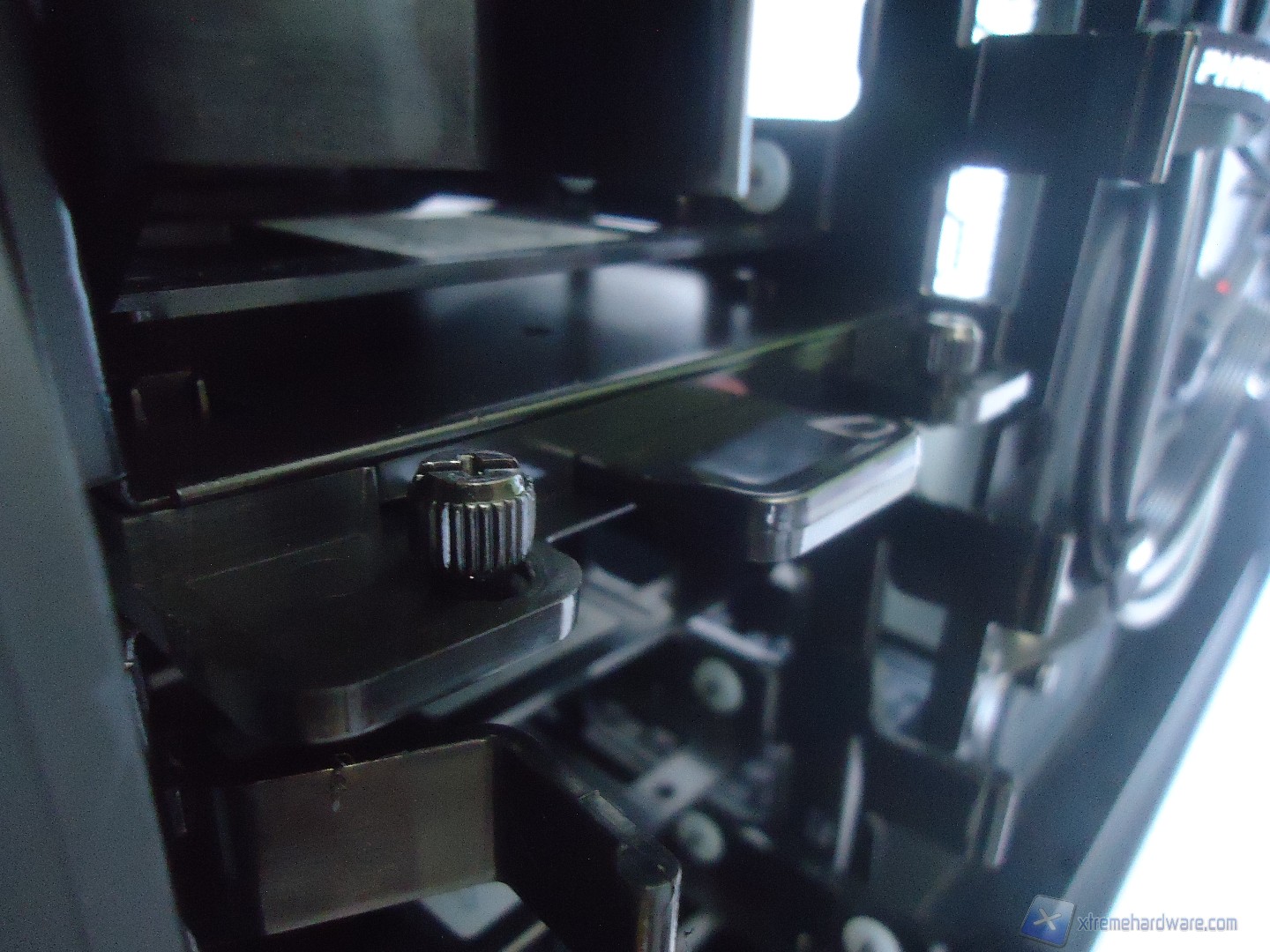 Questa parte del case appare molto ordinata e ben studiata; sotto i bay esterni da 5,25” troviamo il cestello degli hard disk con 4 slitte ognuno. Il cestello può essere rimosso interamente oppure può essere rimossa una delle due gabbie. Per quanto riguarda gli SSD oppure gli hard disk da 2,5”, sono presenti due predisposizioni, una proprio sotto il retro del socket della scheda madre e una più in basso, alle spalle dell’alimentatore.