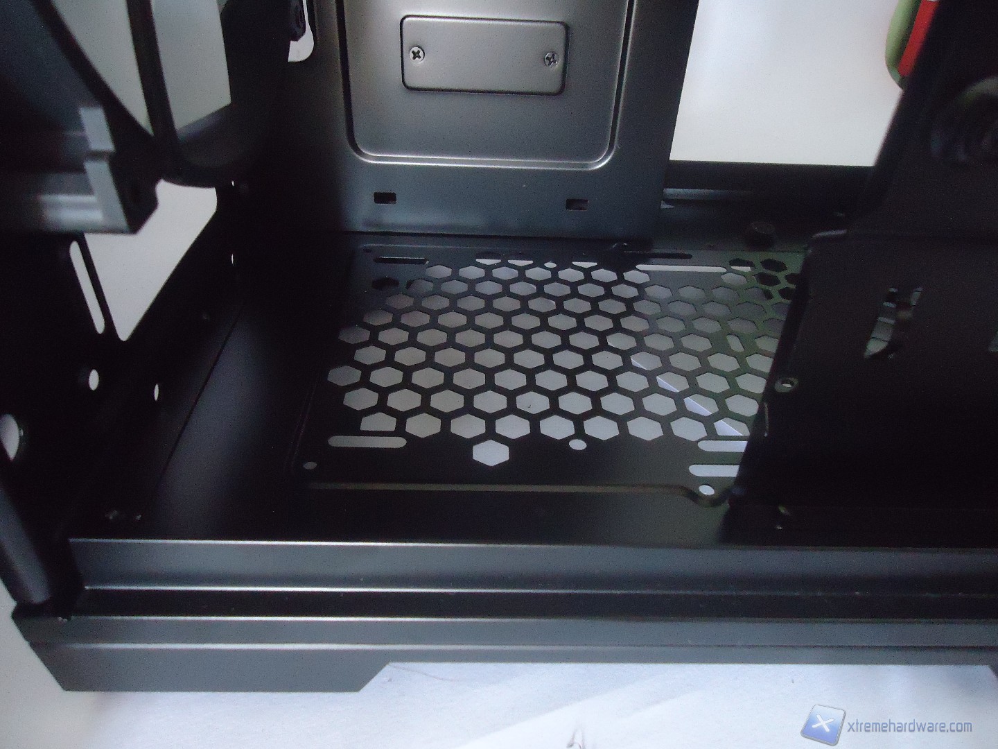 Tolta la copertura possiamo notare come l’alimentatore venga adagiato su dei piedini antivibrazione, nonché la presenza di un ulteriore passacavo gommato per far passare i cavi dell’alimentatore nella parte destra del case. Vi è oltretutto sul fondo del case una predisposizione per montare altre due ventole da 120mm oppure un radiatore da 240mm. Nella foto i filtri antipolvere (mostrati in precedenza) sono stati rimossi per rendere più visibile il fondo del case.