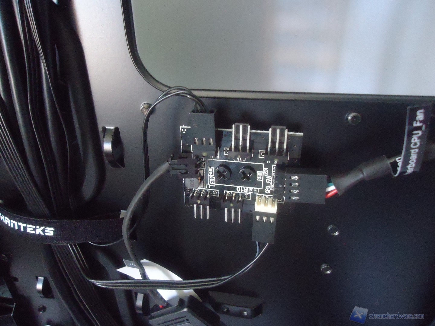 Sul retro del case c’è anche un piccolo fan hub PWM che va collegato alla presa CPU_FAN della scheda madre e invia il segnale PWM ad altri 6 canali. Nel caso in cui l’assorbimento delle ventole utilizzate superi quello previsto dal manuale della scheda madre è possibile alimentarlo tramite un molex 12V. Il funzionamento è comunque spiegato in maniera molto dettagliata sul manuale.