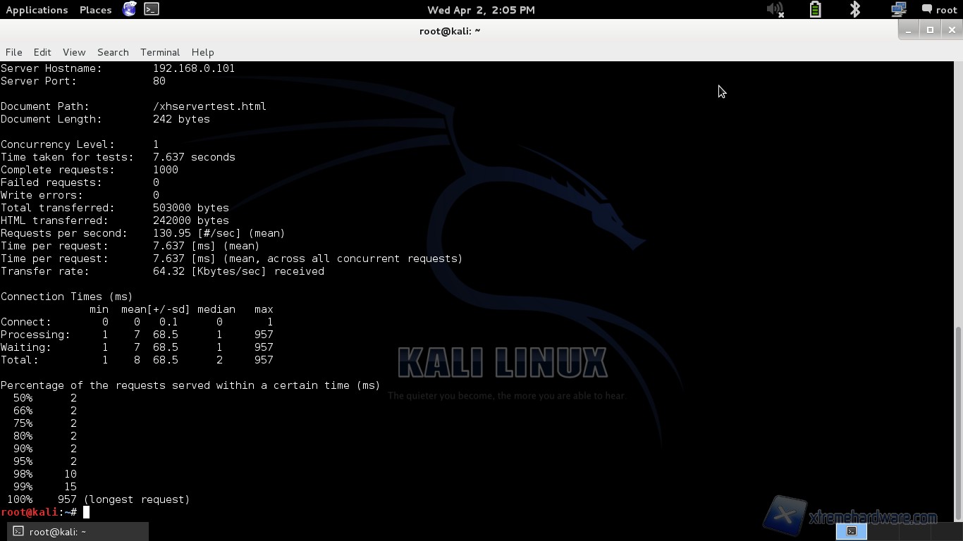 Con questo test effettuato attraverso il sistema operativo Kali Linux, utilizzando il software Apache Benchmark (ab) ed attivando il supporto phpBB sul NAS abbiamo potuto ricavare quanto tempo impiega il sistema per gestire 1000 richieste di accesso ad una pagina web hostata sul NAS stesso.